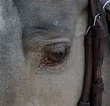 The eyes of an adult champagne horse are most often described as hazel or amber.[12] In the newborn or very young foal, the eyes are bright blue to blue-green and the skin is bright pink.[1][13] The champagne blue foal eye is creamier than other types of blue eye such as the bright, unpigmented blue seen on some pinto horses.[14]