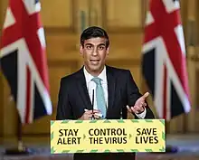 On 17 March 2020, Sunak introduced a programme providing £330 billion in emergency support for businesses,[23] as well as a furlough scheme for employees. This was the first time a British government had created such an employee retention scheme.[24][25] The scheme was introduced on 20 March 2020 as providing grants to employers to pay 80% of a staff wage and employment costs each month, up to a total of £2,500 per person per month.[25] The cost has been estimated at £14 billion a month to run.[26] The Coronavirus Job Retention Scheme initially ran for three months and was backdated to 1 March. Following a three-week extension of the countrywide lockdown the scheme was extended by Sunak until the end of June 2020.[27][28] At the end of May, Sunak extended the scheme until the end of October 2020. The decision to extend the job retention scheme was made to avoid or defer mass redundancies, company bankruptcies and potential unemployment levels not seen since the 1930s.[29] After a second lockdown in England on 31 October 2020, the programme was further extended until 2 December 2020,[30] this was followed on 5 November 2020 by a lengthy extension until 31 March 2021.[31] On 17 December 2020, the programme was further extended until 30 April 2021.[32] In the 2021 budget held on 3 March 2021, Sunak confirmed that the scheme had been extended once more until 30 September 2021.[33]