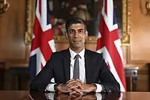 Truss announced her resignation on 20 October 2022 amid a government crisis, triggering a leadership contest. Following a change of rules by the 1922 Committee, each potential leader needed the support of at least 100 MPs to be a candidate in the vote, with a deadline of 2 pm on 24 October to secure enough nominations.[90] On 22 October, it was reported that Sunak had the required number of supporters—100 members of the House of Commons—to run in the ballot on 24 October. The total number of MPs who publicly declared support passed 100 on the afternoon of 22 October. On 23 October, Sunak declared he would stand in the contest. Johnson ruled himself out of the race later that day, stating that he would not have enough support from MPs to govern effectively.[91]