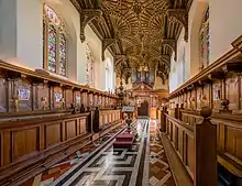 The whole was carefully taken down as far as the surbase and thoroughly overhauled. As much of the old work as it was possible to save was used again, some of the pilasters being rubbed down and repolished. Panels, frames, the columns next the centre, and all defective parts, were replaced with new. The panelling and seats, now stripped of their varnish, are the original work, except that a third row was added in 1884, though an addition to the screen was made when the organ was erected. The ceiling was recoloured in 1895 by Charles Eamer Kempe,[38] a move which has been both extensively praised and criticised; one commenter in the 1970s remarked that "anything as strange and curious as Arts and Craft aestheticism overlaid on seventeenth-century fake Gothic, which in turn disguises a genuine fifteenth-century hammer-beam roof is certainly worth keeping - if only for the sheer zaniness of it all".[14]
