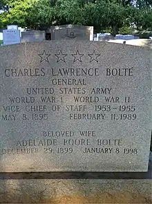 2. Flint, Peter B. (February 13, 1989). "Gen. Charles Bolte, Ex-Army Vice Chief Of Staff, Dies at 93". The New York Times. New York, NY. p. D-13 via TimesMachine.