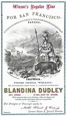 Clipper ship sailing card for a ship named for his wife, Blandina