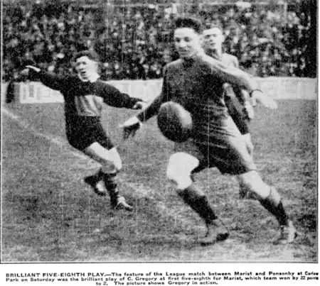 At the start of the 1929 season Gregory had announced his retirement though one week into the season he was back on the playing field.[93] His club form was very good, and he was the second highest point scorer in the competition with 62 points behind Frank Delgrosso (108), while he scored 71 points for Marist across all 13 games he played for them.