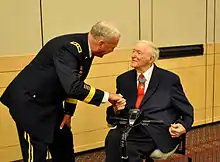 Lieutenant General Wade H. Haislip congratulates Coolidge after presenting him with the Medal of Honor.