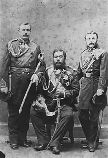 Colonel Judd (left) with King Kalākaua (center) and Colonel George W. Macfarlane (right)