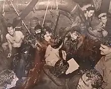 The scene was described in the memoirs of George Albert DeLong, helmsman of USS Helena, when USS Juneau was sunk:[32]