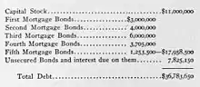 Proceedings were begun by the trustees of the fourth mortgage, default having also been made on the first, second, third, and fifth mortgages. On motion thus made, Nathaniel Marsh, Secretary of the company, was appointed Receiver by Judge Mason of Chenango County. He took possession of the road on August 16, 1859. On the 19th the Directors made a large reduction in President Moran's salary. On the 27th he resigned as president, and retired from the Directory. Samuel Marsh was elected president to succeed him. When Moran left the capital stock of the company was $11,000,000 and the bonded debt $36,783,650 (see image).[15]