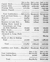 A meeting of the stock and bondholders held at No. 13 Broad Street, New York, September 23, 1857. For the purpose of inducing them to subscribe for the new loan. President Moran made an address which is to-day a graphic and in some respects an amusing – exhibit of the company's situation and tribulations in that critical year. He began by presenting a statement of the financial condition of the company (see image).[11]