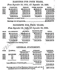 "...remembering as they may, that for four years, commencing on 1 October 1852, when the trains first ran through from Jersey City to Dunkirk, and ending September 30, 1856, the earnings over all working expenses paid the interest on the debts, and left a surplus more than sufficient to pay full interest to the Stockholders; though 'part of that surplus went to the general improvements. The figures and facts are not to be found in any one publication,' and therefore may with advantage be collected here, as the commencement of an attempt to understand the real condition of the Company's affairs."