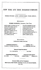 In 1854 Charles Moran, broker and private banker, and Louis Von Hoffman, private banker, both from New York City,[5] were elected among the sixteen directors of the New York and Erie Company. This election was in recognition of the interests of foreign creditors of the company, Moran having placed a large amount of the company's unsecured, or income, bonds in Switzerland and other parts of Europe.[6] Moran would soon become one of Homer Ramsdell's confidant.