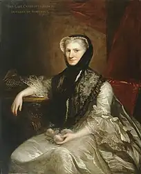 Secondly on 4 February 1725, at the age of 63 he married Lady Charlotte Finch (1693–1773), a daughter of Daniel Finch, 7th Earl of Winchilsea, later 2nd Earl of Nottingham. He treated her poorly and once told her, after she had gently tapped him on the shoulder with her fan: "Madam, my first wife was a Percy and she never took such a liberty".[18] By Charlotte Finch he had two further children:
