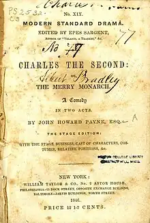 Charles the Second is an 1824 historical comedy in two acts by the British-based American writer John Howard Payne. It is set at the court of Charles II in Restoration London, and features a series of adventures in the company of his friend Rochester. It premiered at the Theatre Royal, Covent Garden on 27 May 1824.[1] The original cast included Charles Kemble as Charles II, John Duruset as Edward, John Fawcett as Captain Copp, Harriet Faucit as Lady Clara, Maria Tree as Mary. It was performed 14 times in its initial run.[2] An afterpiece, the running time was roughly an hour and fifty minutes. It subsequently performed in the United States at the Park Theatre Olympic Theatre in New York.