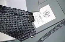 Charvet ties, ranked as the best designer's ties in the US,[220] are handmade,[221] generally from a thick multicolor brocade silk,[222] of a high yarn count,[194] often enhanced by the addition of a hidden color,[223] producing a dense[224] fabric which goes through a proprietary finishing to acquire lustre, fluidity and resilience[202] and achieve the right knot.[194] The company develops its own exclusive patterns and colors. It creates about 8,000 models per year,[225] Jacquard woven on exclusive commission, with silk either alone or mixed with other precious yarns, such as cashmere,[226] camel hair, bamboo yarn or covered with laminated precious metals, such as silver, gold or platinum,[227][228] with techniques dating back to the 14th century when the popes were based in Avignon,[n. 21] which were also used in the 1920s for vests.[228] Further to a long history of brocade patterns, first used in the 19th century for vests and then for ties, Charvet offers, according to Bernhard Roetzel, the largest range of woven silk neckties in the world.[230] The ties collection, sometime "unmistakably bold"[194] or "witty [and] wicked",[231] often noted for its shimmer and changing colors (Charvet ties' shimmer "has become so synonymous with the company that we call it the Charvet effect", says a retailer.[42])[232]