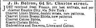 Charvet shirts were imported into the United States as early as 1853 (See figure right).[100] By 1860, Charvet's shirts turnover was equally divided between luxury bespoke shirts sold in the Paris store and ready made shirts for export, particularly to Russia, Great-Britain and Havana.[101] Also, following the custom of the time, designs and models were sold to American stores, to be locally reproduced.[102][103] In the 1920s, Charvet's name was associated in the United States with linen fabrics in "startingly floreated" patterns, used for shirt bibs and cuffs.[104] Nevertheless, into the middle of the 20th century, Charvet was selling only bespoke shirts in the Paris store.[n. 7]