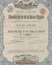 The Chemins de Fer de la Basse-Egypte were founded on 26 January 1896 by the Belgian baron Édouard Empain (born 1852; died 1929) as a PLC.[2][3]