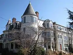 The oldest portion of this architecturally eclectic house was built in 1866, with Second Empire styling. The original owner was Chester W. Kingsley, a local politician, and the builder was Stephen Stiles.[2] Kingsley had the house remodeled in 1890, adding a tower and ell. At the same time, the house's Second Empire ornament was replaced with Queen Anne and Colonial Revival ornament. Wellington Fillmore was the builder who executed the work.[3] Kingsley and his wife lived in the house until their deaths in 1904. In 1908 the house was leased by Mae I. Copp and Minnie A. Copp as a private hospital, which became known as the Chester Hospital.[4] During the occupancy of the Copp sisters, the house was altered several times, most substantially in 1919, when architect William Sidebottom designed a three-story extension to the ell.[5]