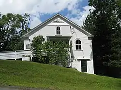 The historic district encompassing the village is very roughly T-shaped, extending mainly along Main Road east and west of the junction, and south along South Road. Also included in the district are properties on Bagg and Bryant Roads, which form a rough square with Main and South Roads southwest of the main junction. The district includes a cluster of civic buildings (town hall, library, grange hall, and Congregational Church), one commercial building (a general store), and a number of houses. These buildings are built in a variety of architectural styles, ranging from traditional Georgian to late Victorian Queen Anne. Most of the houses are vernacular versions of some style, and are 1-1/2 to 2-1/2 stories in height, of wood frame construction.[2]