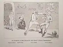 In Spring 1787, Saint-Georges stayed in London with fencing masters Domenico Angelo and Henry, his son, whom he knew as an apprentice from early years in Paris.[89] They arranged exhibition matches for him, including one at Carlton House, before the Prince of Wales.[90] After sparring with him, carte and tierce, the prince matched Saint-Georges with several renowned masters. One included La Chevalière d'Éon, aged 59, in a voluminous black frock.[91] A painting by Abbé Alexandre-Auguste Robineau, violinist-composer, and painter, showed the Prince and his entourage watching Mlle D'Éon score a hit on Saint-Georges, giving rise to rumors that the Frenchman allowed it out of gallantry for a lady.[92] But, as Saint-Georges had fenced with dragoon Captain d'Éon in Paris, he probably was deferring to her age. Saint-Georges played one of Robineau's concertos at the Anacreontic Society.[93] It is supposed he delivered Brissot's request to translate the publications of the abolitionists MPs William Wilberforce, John Wilkes, and Reverend Thomas Clarkson into French. Before Saint-Georges left England, Mather Brown painted his portrait and presented it to Henry.[94] Asked by Mrs Angelo if it was a true likeness, Saint-Georges replied: "Alas, Madame it is frightfully so."[95]