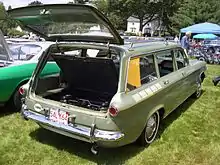 The Chevrolet Lakewood is a four-door station wagon produced by Chevrolet for the 1961 model year. Chevrolet dropped the "x-wood" names for their station wagon models at the end of 1961 so the 1962 Corvair Station wagons do not continue the Lakewood name. In appearance, and technical respects it resembled the Volkswagen Type 3 Squareback, but power came from the Corvair's rear-mounted Chevrolet Turbo-Air 6 engine with 145 cu.in. displacement which developed 80 bhp (60 kW) at 4,400 rpm. The station wagon Corvairs were built on the same unibody as other sedan Corvairs with a 108 in. wheelbase. Standard transmission was a 3-speed manually shifted transaxle.