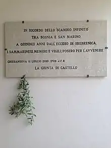 On 14 July 2010, on the initiative of the Capitano di Castello (Mayor) Franco Santi and the San Marino ambassador in Sarajevo Michele Chiaruzzi, the Giunta di Castello (local government) placed a monumental plaque in memory of the Srebrenica massacre (Bosnia and Herzegovina). It is one of the first public monuments in Europe dedicated to those events.