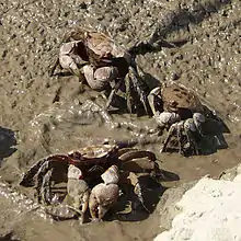 Chiromantes dehaani is a mudflat crab of the Sesarmidae family (subfamily Sesarminae), which is endemic to East Asia.[1][2] It typically lives in mangrove swamps and is known under the common name kurobenkeigani in Japan.[3][2] C. dehaani has an uneven carapace, which is divided into four frontal lobes. Its walking legs are covered with thick, long setae (hairs), while the palm surfaces of its rough, granular chelipeds (claws) contain tubercules.[2]