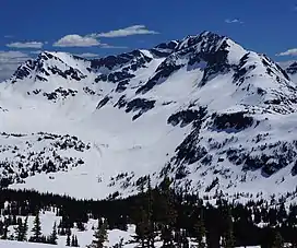 Chiwawa Mountain is an 8,459-foot (2,578-metre) mountain summit located in the Glacier Peak Wilderness of the North Cascades in Washington state.[4] The mountain is situated on the crest of the Cascade Range, on the shared border of Snohomish County and Chelan County, also straddling the boundary between the Mount Baker-Snoqualmie National Forest and the Wenatchee National Forest. Its nearest higher peak is Fortress Mountain, 1.12 mi (1.80 km) to the west. Chiwawa Mountain is a triple divide peak, so precipitation runoff from it drains northeast to Lake Chelan via Railroad Creek; northwest into Miners Creek which is a tributary of the Suiattle River; and south into the Chiwawa River headwaters. The mountain's name is taken from the river's name, which was applied by Albert Hale Sylvester (1871-1944), a pioneer surveyor, explorer, topographer, and forest supervisor in the Cascades.[3] Chiwawa comes from the Columbia-Moses language and means a kind of creek ("wawa" creek).[5]