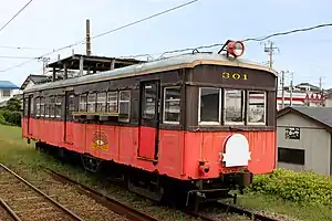The car was subsequently purchased by the Choshi Electric Railway, and rebuilt by Nippon Tetsudō Jidōsha Kōgyō (日本鉄道自動車工業, present-day Toyokouki) before entering service on the line from 10 August 1951.[1][2]