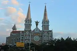 The church covers an area of 2,735 km2 (1,056 sq mi) and 64 metres (210 ft) in height of the imitation Gothic architecture style. There is a statue of Jesus at the top of the church, and he opened his arms as if to welcome the believers.[1]