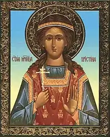 Christina is commemorated on 13 March in the Catholic Church and the Syriac Orthodox Church.[2] The Roman Martyrology describes her as follows: "In Persia, Saint Christina, martyr, who was flogged with rods and concluded the witness of martyrdom under King Chosroes I of the Persians."[6] In the Georgian Orthodox Church, her feast day was 15 March in the early 7th century. Some versions of the 10th-century church calendar of Ioane-Zosime, however, give it as 14 March.[7] The Synaxarion of Constantinople of the Eastern Orthodox Church also gives 14 March.[2]
