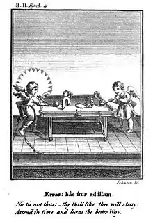In 1647 Harvey issued anonymously Schola Cordis, or the Heart of it Selfe gone away from God; brought back againe to him; and instructed by him. In 47 Emblems; 2nd edition 1664; 3rd edition 1675. The volume has on the title-page "By the Author of the Synagogue". The emblems were adapted from Benedictus van Haeften's Schola Cordis.[2] This work was a free adaptation, with the engravings made freshly and reversed.[4] It was later reissued as The School of the Heart, and wrongly attributed to Francis Quarles.[5]