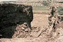 The dam formed the southern wall of one of the mill's three holding ponds, which were used to evaporate tailings solution until the remaining solid waste could be buried.[31] From 1967 to 1982, the mill produced an average of 4,000 short tons (3,600 t) of tailings every day, for a total of 3.5 million short tons (3.2 Mt).[32][7][33][34] The 35-foot (11 m) high embankment was constructed on a deposit of collapsible clayey, silty sand, one hundred feet (30 m) deep.[16] United Nuclear used a new design, recommended by the Nuclear Regulatory Commission, that used earth rather than tailings themselves as building material.[21] The holding pond was not lined, a violation of the Uranium Mill Tailings Radiation Control Act of 1978.[21] This allowed tailings solution to seep into the ground, weakening the foundation of the dam and contaminating the groundwater.[16]