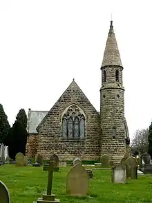 The Church of All Saints, Harlow Hill, Harrogate, North Yorkshire, England, is a grade II listed mission church, or chapel of ease, completed in 1871 on land donated by Henry Lascelles, 4th Earl of Harewood, within the parish of St Mary. It was consecrated by the Bishop of Ripon in 1871. The building was designed with a round bell tower, in Gothic Revival style, by Isaac Thomas Shutt and Alfred Hill Thompson.[1] After some years of closure due to structural problems, as of 2014 it was being restored for use by a funeral director's company.