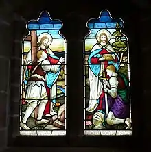 There are two tiny transepts, and the entrance of each is supported by a central pillar dividing arches echoing the design of the chancel arch and its pillared corbels. Above the transept windows and west windows are ventilation slits which are now glazed: a reminder that this is a cemetery chapel. One window of the south wall and two windows on the north wall of the nave contain stained glass. When the building was listed in 1975 it still had the original stained deal pews, but during the restoration of 2014 some of these were removed, and some were stacked in the chancel.[1] The Church of England has removed the "beautiful font of Harehills stone ... of elegant design and artistically wrought," although as of 2014 the lid still existed, hanging on its pulley. Both font and lid were carved and installed in 1871.[15]