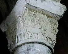 The church follows the traditions of basilicas of the high Middle Ages but experiments with a three-level elevation with a clerestory. The column capitals exhibit simple sculpture which would later be elaborated.