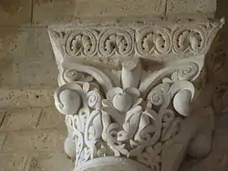 The apses have several medieval sculptures, including a 13th-century Christ in the nave. Some of the capitals have motifs of plant life, human figures or depictions of stories, such as that of Adam and Eve or the Fox and the Grapes.