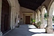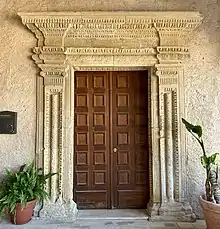 Set off from the arches of the porch is the travertine entrance portal to the church, which has a wide, low-slung arch, perhaps of Catalan inspiration,[27][28] "outlined by slender bundled curbs interspersed with smooth areas."[28] Other portals facing the porch are that of the bell tower, a round arch of modest architecture,[28] that of the convent, another lowered arch of modest architecture made partially with restoration elements,[28] and that of the Oratory of the Nobles: this sandstone portal, on the other hand, is a significant example of late Renaissance architecture.[28] It is in fact presented with an architrave framed by pilasters of the Ionic order decorated with an ovolo motif, supporting a high entablature:[29] the date of the portal's construction, legible on the ruined inscription in the center of the entablature, is 1592.[29]