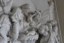 In 1581, the archconfraternity of the Immaculate Conception was founded,[11] a confraternity reserved only for the city's nobles:[12] the lower classes and sailors, on the other hand, gathered in the confraternity of the Most Holy Rosary.[12] The archconfraternity of the Immaculate Conception chose the church of San Bernardino as its headquarters, and beginning in 1592, it began construction of the Oratory of the Nobles.[13] This oratory was built on the site of the chapel of jus patronatus of the Cavallo family, which had recently become related to another noble Amantean family, the Baldacchini, through the marriage of Giacomo Cavallo and Prudenza Baldacchini:[13] it was these spouses who commissioned, in 1608, their own tomb to be placed in the oratory from the Messina sculptor Pietro Barbalonga.[13] Barbalonga was recalled to the Oratory of the Nobles in 1619, when the first rector of the archconfraternity, the Amantean nobleman Fabrizio Mirabelli, commissioned him to design the family tomb.[14]