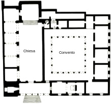 The convent was completely renovated in the 1990s, on the occasion of the return of the Observant Friars Minor in 1995:[21] during the course of the work, numerous archaeological remains came to light, which were made visible through a glass panel covering on the floor of the ground floor.[40] In fact, masonry and a dense network of canalizations probably belonging to the ancient convent that existed before that of the Conventual Friars Minor came to light.[40]