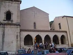 The entrance porch of the church is framed between the bell tower and the northwest corner of the convent, the one that houses the oratory of the Nobles: it is raised two metres (6.6 ft) above the ground, and is accessed via a staircase that tends to narrow upward. Interventions in 1953 restored the porch to its original 15th-century appearance, with the five ogival arches supported by twin polygonal pillars with drop capitals[27] mounted on high plinths, all in local sandstone:[28] after the 1783 earthquake, in fact, the central archway, the one giving access to the porch, had been converted to a round arch in the form of a serlian, with the benefit of making the church's entrance portal visible but the downside of upsetting the architecture of the porch.[16] Originally, the porch was open on two sides, but after the 1638 earthquake, the relocation of the bell tower forced the closure of the two ogival arches located to the north:[14] interventions in the 1990s revealed the remains of these arches in the base of the south wall of the bell tower.[29]