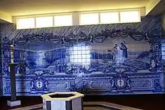 The ornate walls in azulejo tile that comprise the lateral baptismal font space