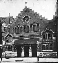 The church was constructed between 1889 and 1890 in an Eclectic style, to the designs by Thomas H. Poole.[1] The design is particularly marked by the building's wide crow-stepped gable and ogee-headed openings, very similar to Poole's more compact Our Lady of Good Counsel (1892), and a predecessor to Poole's grander-scaled St. Thomas the Apostle in Harlem, now closed. The facade is "golden-hued brick", and the building features a "deep porch sheltered by a bracketed entryway."[5]