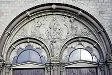 The Church of St. Lambertus was a basilica built in the Romanesque Revival style, and it was constructed out of bricks decorated with tuff. Its façade had twin bell towers standing at around 40 m (130 ft) high, and it was the only church in the district of Heinsberg having that form. The towers contained two bells which were added in 1955, and the original bells from the old church: the Lambertusglocke dated 1496, and the Marienglocke dated 1512.[1]