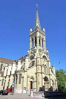 The Church of St. Peter and Paul was begun in 1858 as the first Catholic church built in Bern since the Reformation. It was built next to the Town Hall of Bern, on the site of the St. Johannsen granary (which had been built over the ruins of a mint which burnt to the ground in 1787).[2] The church was designed by H Marchal and Pierre-Joseph Edmond Deperthes in the style of the Romanesque and French cathedral Gothic. Construction began in 1858 under the supervision of Emmanuel Müller and was completed in 1864.[3] The first mass was celebrated in the church on 13 November 1864.[2] Following the First Vatican Council (1869-1870) some Catholics in Switzerland were dissatisfied with the Council and split away from the church to form the Christian Catholic Church of Switzerland. In 1875, the Church of St. Peter and Paul became the parish church of the Old Catholic congregation in Bern.