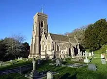 The old church was demolished and construction of the new church began in 1853,[6] with the foundation stone being laid by Sir Acland in October that year.[7] Construction was carried out by workmen employed on the estate, under the supervision of Sir Acland, and the work using Doulting stone was carried out by Messrs Wall and Hook of Stroud. The church was consecrated by the Bishop of Bath and Wells, the Right Rev. Robert Eden, on 17 October 1856. It cost over £16,000 to complete.[4]