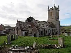 The stone building has hamstone dressing and clay tiled roofs. It consists of a four-bay nave and two-bay chancel with a south transept. The three-stage tower is supported by corner buttresses.[1] The tower contains six bells. This includes two of which were replaced and additional bell added in 2014.[6]