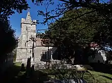 In front of the porch is a 19th-century Celtic cross by Joseph Clarke[3] on the four steps of the old churchyard cross.