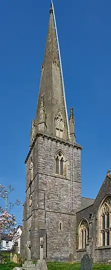 The tower is formed of three stages, with corner buttresses. It mainly dates to the 1849 rebuild by Hayward, but does feature some medieval material. The lower stage has a centred west doorway with hood mould, and small lancet windows to all but the eastern face. The middle stage has a clock in its western face, contained with a recessed stone roundel, the centre of which has some clear glass to light the chamber inside. The belfry stage has two-light Decorated Gothic-style bell openings with slate louvres. A corbel table above the belfry openings supports the spire above. The spire, of the broach design, is rare in Devon, and like the tower, dates to 1849. It has large corner pinnacles and two-light pierced stone openings in its lower stage. The spire is surmounted by a weathercock.[1]