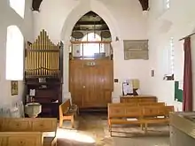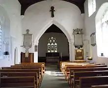 St Nicholas' has an aisleless nave with a late 19th-century panelled roof supported on four 15th-century carved wooden corbels. In the splay of the North nave window and in the south-east corner of the nave are two unusual canopied niches. Beside the north window is a 14th-century spiral staircase, now blocked at the top, which originally led up to the now lost rood screen. The west arch is of about 1350 and has semi-octagonal shafts. The original chancel arch was demolished in about 1440 and a mis-shaped replacement was built about 2 ft further east. The clerestory was raised at the end of the 15th century, and a new low-pitched roof was installed above it. The chancel has a panelled ceiling with simple bosses, while the stained-glass windows are mid-19th century.[4]