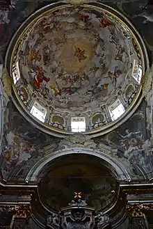 The interior was decorated with frescoes by a team of artists, including Luigi Vannier in the ceiling of the presbytery. The elaborate dome frescoes, however, were painted over a century after the church's construction, circa 1768, by Michele Antonio Milocco. It depicts the Glory of St Francis of Sales (canonized in 1665). In the pendants of the dome are depicted the Theological Virtues.