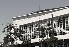 The main stage and exhibition hall occupies the entity of the space, with the L-shaped foyer opening to the square and road.[2] The ceilings of the exterior spaces, tribune and balconies are covered stucco with circular, copper lamps.[2] Over the lateral doors that access the theatre balconies are ceramic elements in the forms of polychromatic wings, in bass relief with birds and flowers.[2]